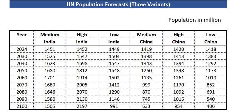 View the trends graphicallyTable below compares expected populations of India and China under the three scenarios